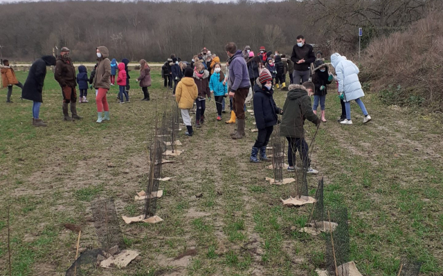 L’école de Saint-Ouen en Brie a été associée à ce projet. D’ailleurs tous les élèves avec l’équipe enseignante sont venus le lundi 3 janvier aider à la plantation des arbustes qui formeront les haies.